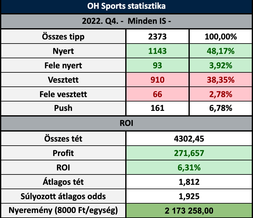 ➡️ 2022. Q4: 2373 tipp; +271.657 egység; +6.31% ROI ✅