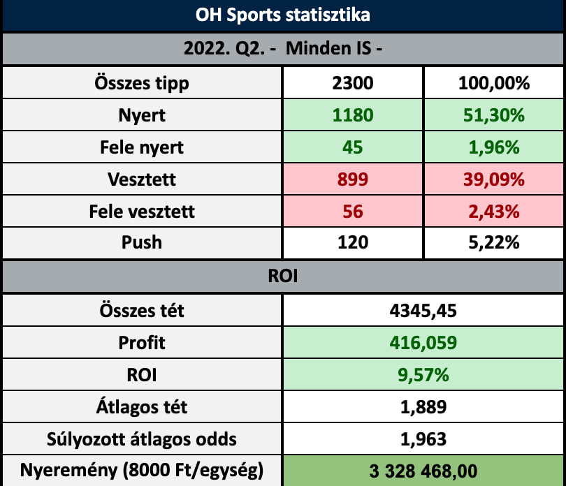 ➡️ 2022. Q2: 2300 tipp; +416.059 egység; +9.57% ROI ✅