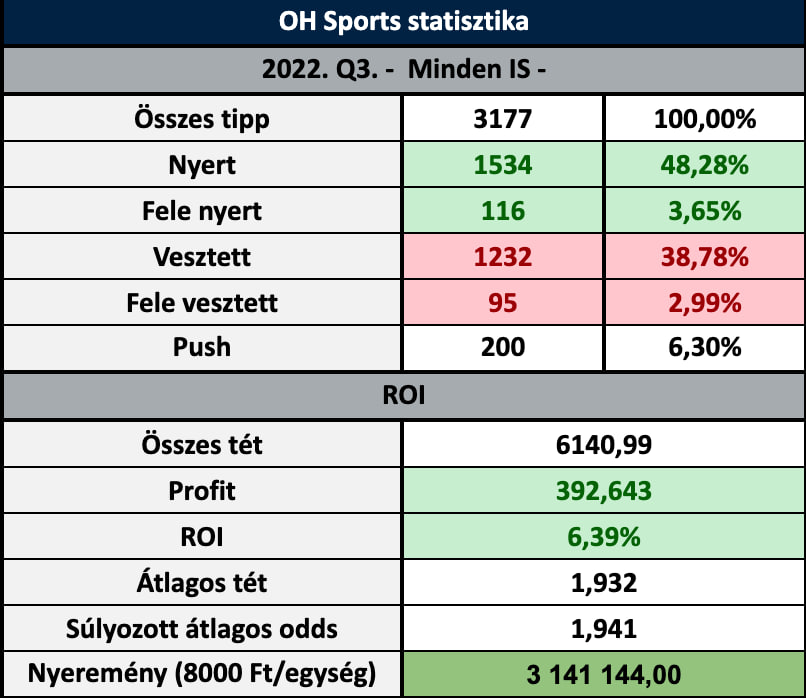 ➡️ 2022. Q3: 3177 tipp; +392.643 egység; +6.39% ROI ✅