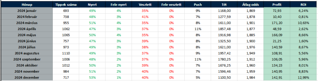 ➡️ 2024. Q4: 2713 tipp; +418.090 egység; +9.56% ROI ✅