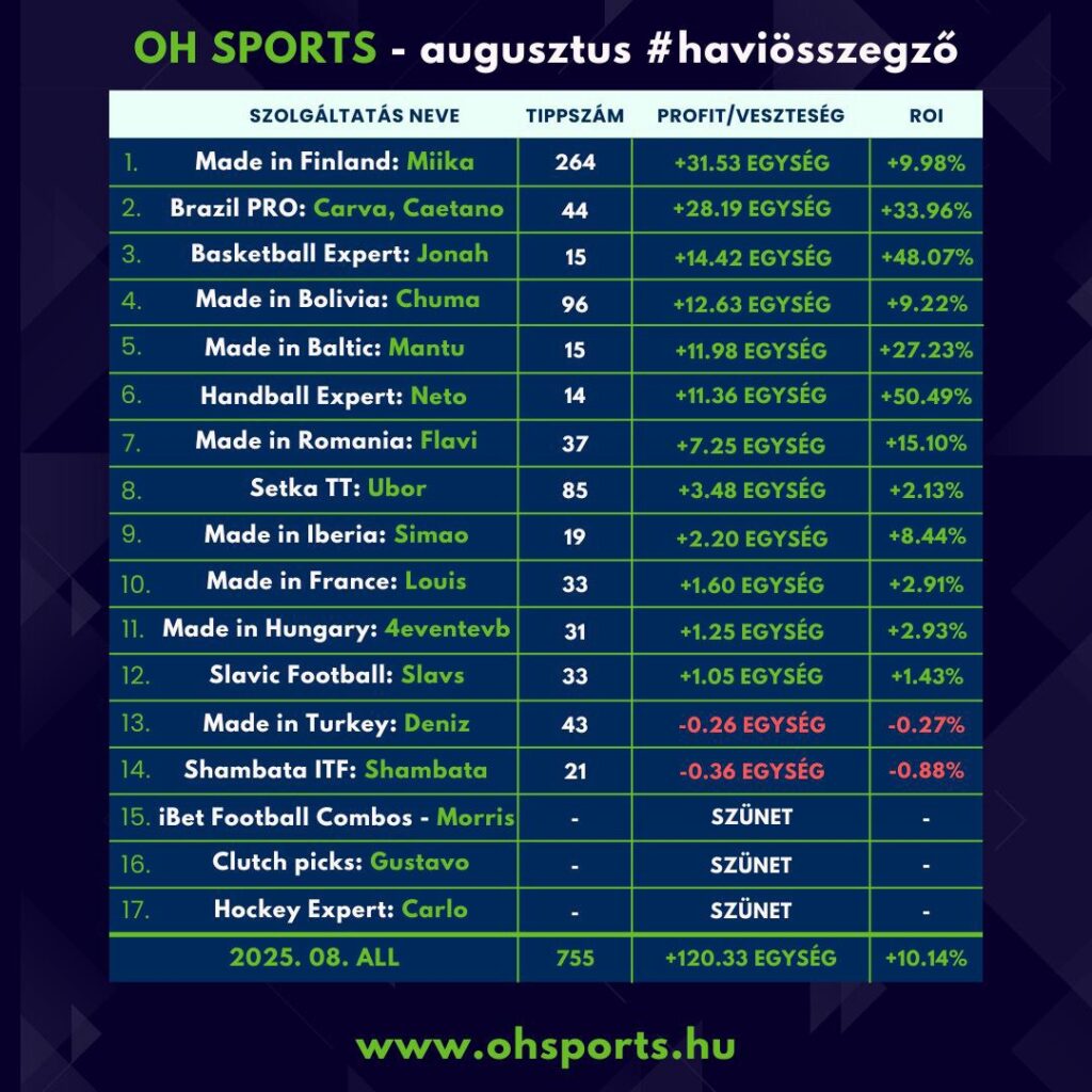 2025. 08: 755 tipp; +120.334 egység; +10.14% ROI ✅