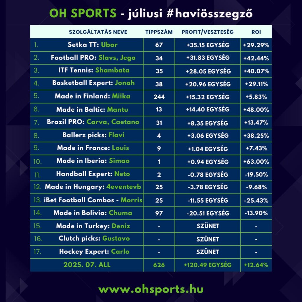 2025. 07: 626 tipp; +120.492 egység; +12.64% ROI ✅