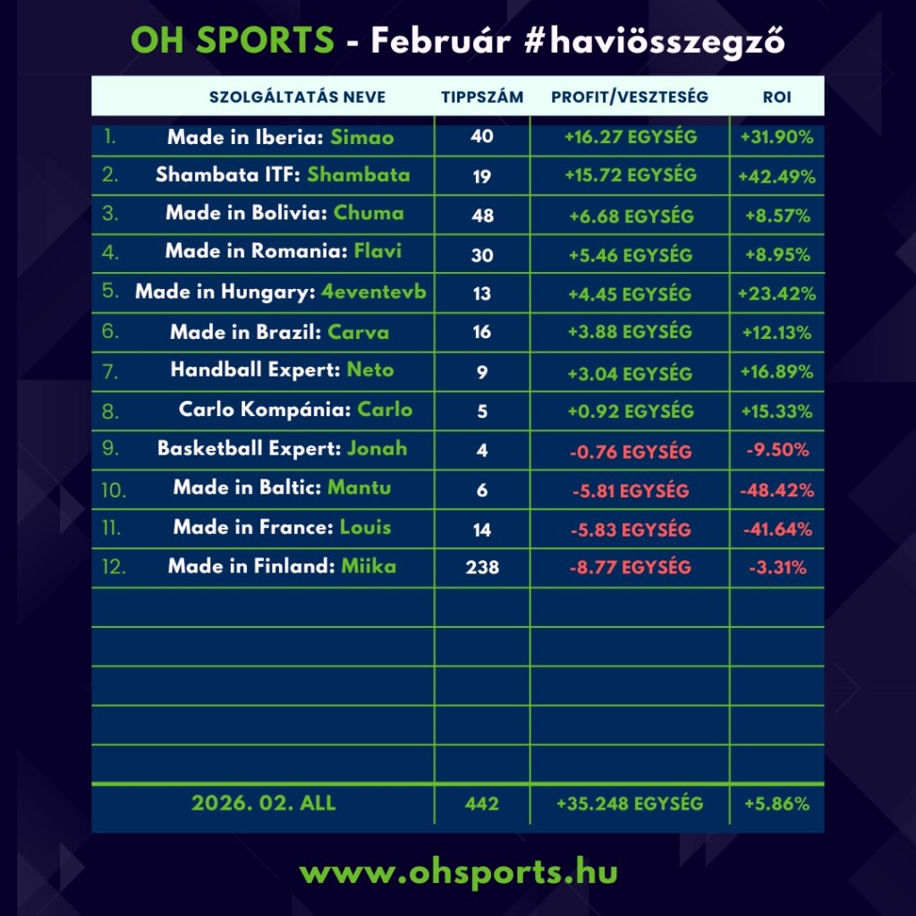 2026. 02: 442 tipp; +35.248 egység; +5.86% ROI ✅